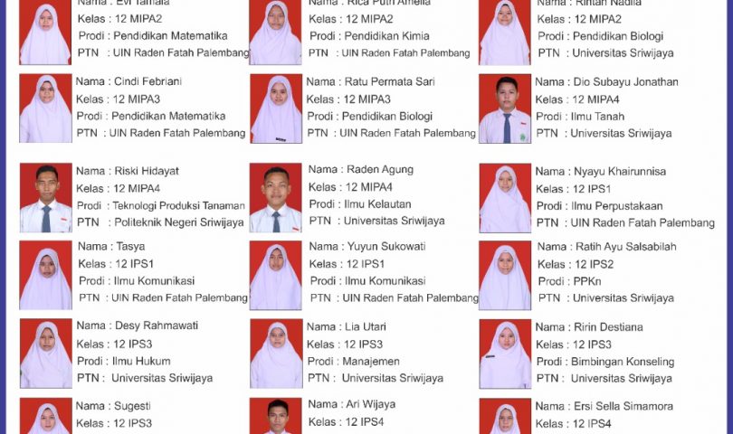 Diantara peserta didik program MIPA, yang diterima melalui jalur SNPMTN, Evan Febrian Prodi Teknik Informatika Unsri, Khairudin Prodi Pendidikan Matematika Unsri, Rintan Wirnanti Prodi Sistem Informasi Unsri, Evi Tamala Prodi Pendidikan Matematika UIN Raden Fatah, Rica Putri Amelia Prodi Pendidikan Kimia UIN Raden Fatah, Rintan Nadila Prodi Pendidikan Biologi UIN Raden Fatah, Cindi Febriani Prodi Pendidikan Matematika UIN Raden Fatah, Ratu Permatasari Pendidikan Biologi UIN Raden Fatah, Dio Subayu Jonathan Prodi Ilmu Tanah Unsri, Riski Hidayat Prodi Teknologi Produksi Tanaman Politeknik Negeri Sriwijaya, Raden Agung Prodi Ilmu Kelautan Unsri.