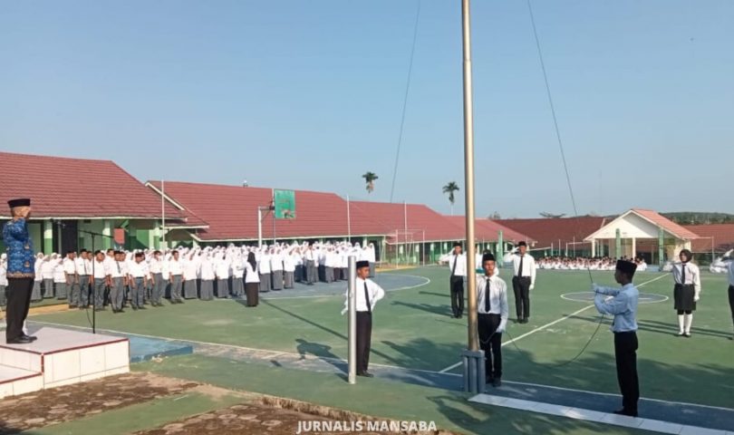 Pasukan pengibar bendera (Paskibra) peserta didik MAN 1 Banyuasin (Mansaba), sukses mengibarkan bendera merah putih, pada upacara peringatan HUT RI ke-77, di lapangan upacara Mansaba, Rabu (17/8).